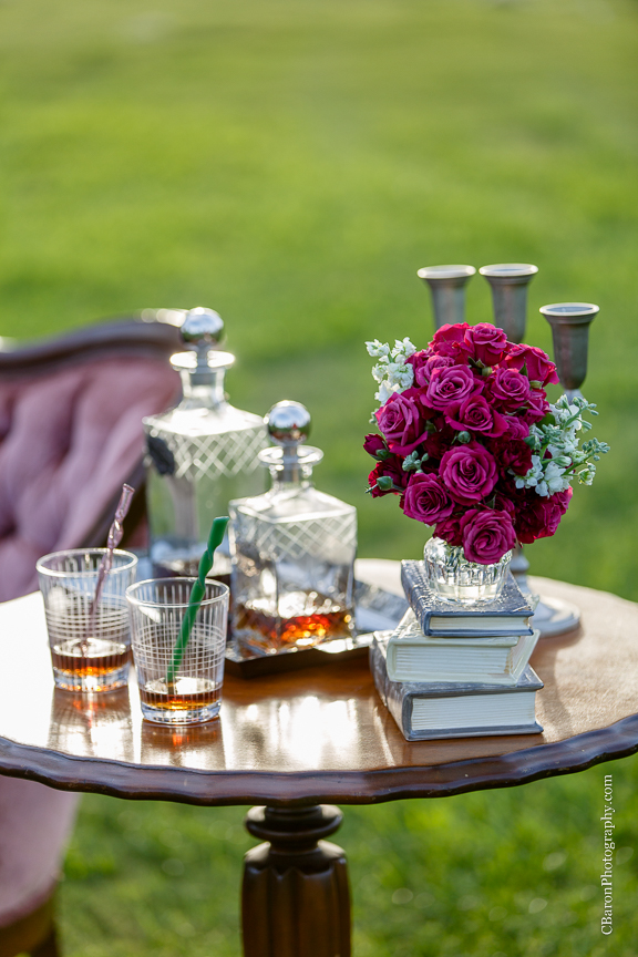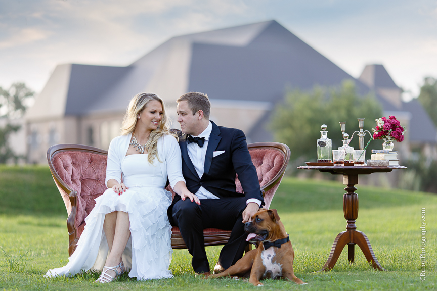I was super excited for the little bit of rain we saw recently. You would think that I had seen enough of it with all of the rain we have seen in 2015! Don’t get me wrong, I love rain, but it has wreaked so much havoc on some of our beautiful bride’s plans! Weddings have been forced to be moved indoors and so many engagement sessions have had to be rescheduled because of torrential downpours! One such bride was our lovely, Kari. Kari had such a vision for her engagement session. This included antique furniture, formal wear, and their furbaby, Kobe. Sounds incredible already, right? Well, her session had to be rescheduled due to rain, not once, but three times! Three! I felt so bad for Kari each time this happened, but as you can see it was well worth the wait! The engagement session took place on Raveneaux Country Club’s golf course. If you haven’t been there, the place is absolutely gorgeous! The Country Club itself resembles a castle and the golf course has beautiful trees with Spanish moss hanging from them. It just feels like a magical place! When Kari and Matt arrived, you could tell that Kobe was super excited and ready to play. Yet, he somehow knew when it was time for his close up because he behaved perfectly! Didn’t he look handsome in his bow tie??? Even mother nature seemed to offer an apology for all of the unexpected rain because there was the most beautiful sunset that evening! We had so much fun riding the golf carts and capturing Kari and Matt’s incredible images. We can’t wait for their elegant fall wedding, as we know that it will be absolutely breathtaking!
