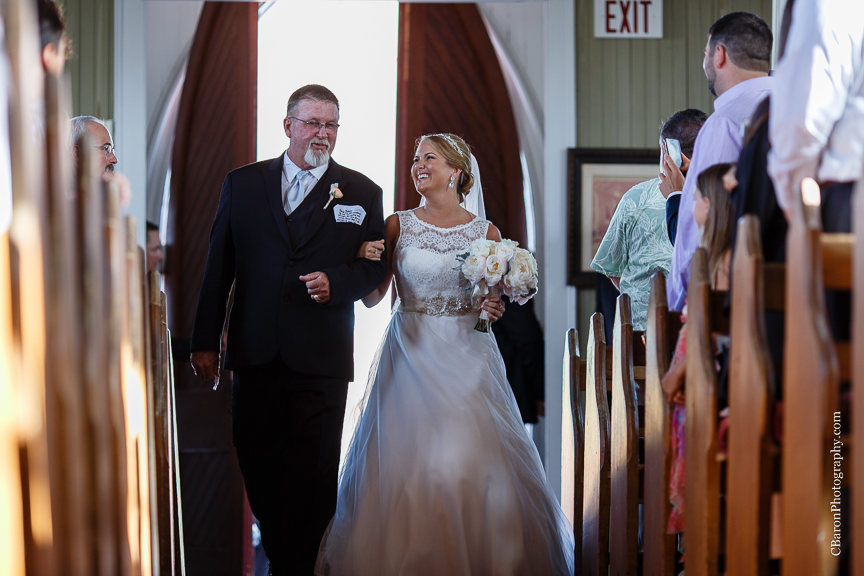 Maggie and Anthony said their vows in the beautiful 1859 St. Joseph’s Church. It is the oldest wooden church structure in Galveston and the oldest German Catholic Church in Texas. It also just so happens to be a 1900 Storm Survivor! It was the perfect place to get married! It is the most adorable little white church with green shutters and a red door! Besides, any structure strong enough to withstand one of the greatest storms in American history is good enough for me! Both the ladies and the guys took trolleys over to the church, which made the trip so much more fun! While Maggie and Anthony did not have a first look, Maggie shared a first look with her dad as she came off of the trolley. It was so sweet and you could see how proud he was of his little girl! Maggie walked down the aisle as the string quartet played beautifully! It was a beautiful and intimate ceremony.