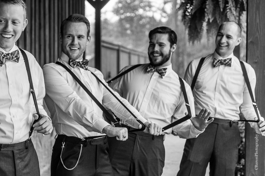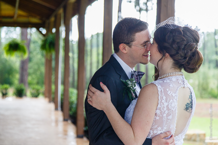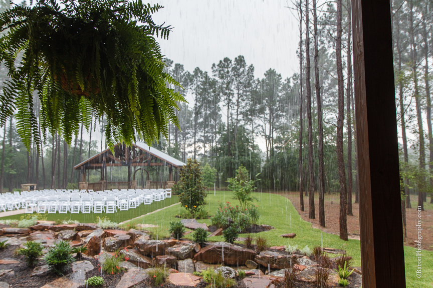 We barely made it in the doors of Crystal Springs when we started hearing thunder. All the chairs had already been set up and were ready to go in hopes that the ceremony could still be held outside. On this day, I was to take some shots of the guys before the First Look. As we were getting ready to head outside, Taylor kept saying, “I really hope it doesn’t rain. Staci will be so disappointed.” I thought this was so sweet and kept my fingers crossed for the storm to blow by. However, no sooner than we made it outside, the rain started. I’m not saying, drizzle or a light rain. I mean torrential downpour kind of rain. I could see the concern on Taylor’s face, but his groomsmen, who were all Aggies, kept the spirit up. It was obvious how happy these guys were for Taylor as they built him up and told him how happy they were for him. Taylor still made the occasional comment about being worried about Staci being upset about the rain. I just thought this was so sweet and it made my heart so sad that they couldn’t get married outside.