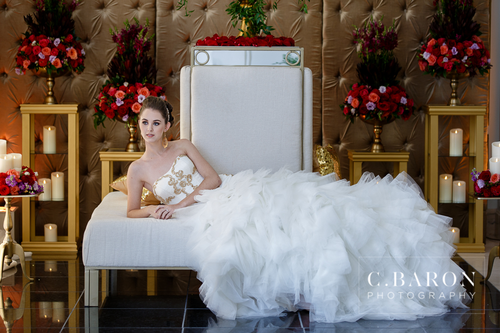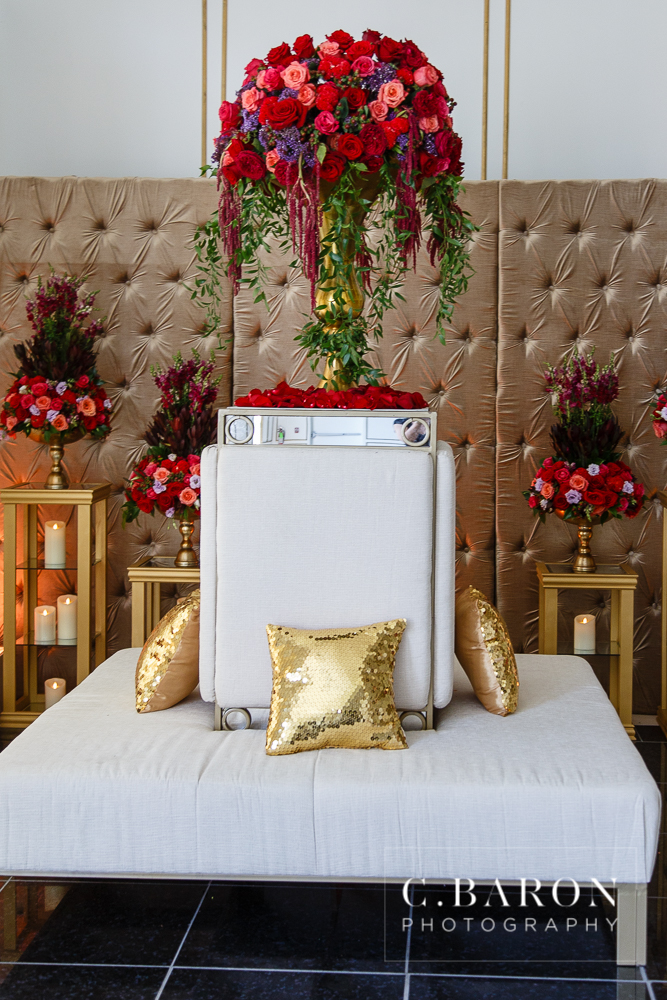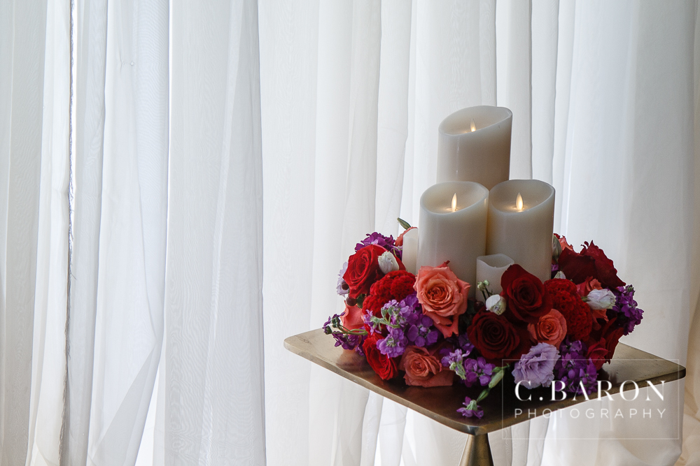 Lounge areas seem to be all the craze – and rightfully so! Who dosen’t need to take a breather every now and again? If you are going to step away from all the happenings and commotion, it might as well be comfortable…and pretty. While at Chateau Cocomar, we had the perfect lounge area designed by Lary’s Florist and Lavish Affairs. It was so incredibly inviting – especially with all of our tired feet! We were all fortunate enough to see more of the lovely jewel tones and candles continued into this room. The sunlight shined through the sheer, billowy curtains so flawlessly and created such a calm and serene environment. However, the gold accents and sequin pillows managed to keep the space feeling luxurious and lively! What a perfect area for a wedding!