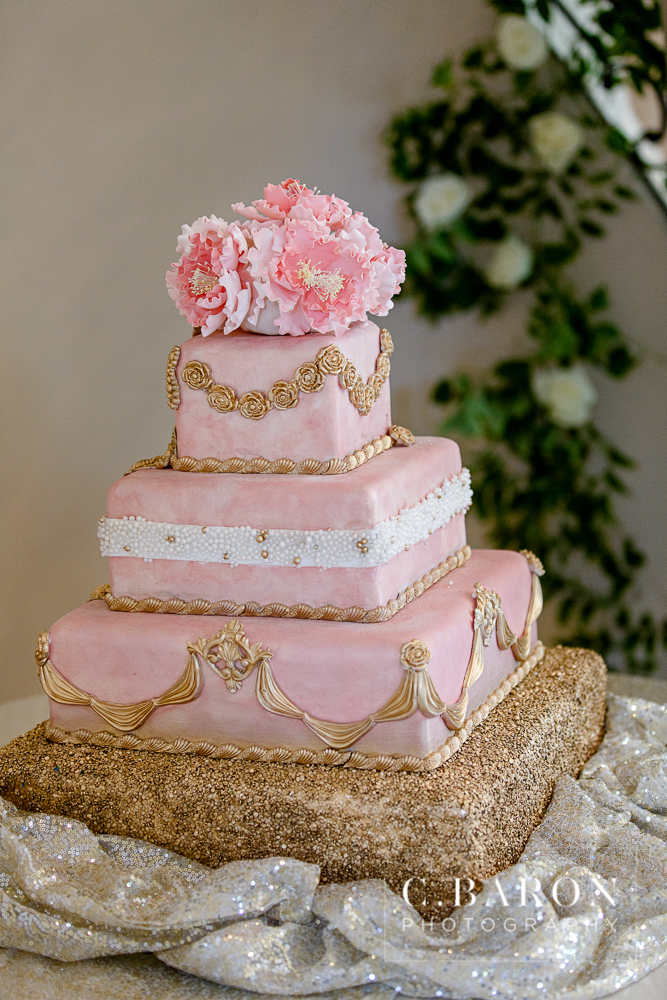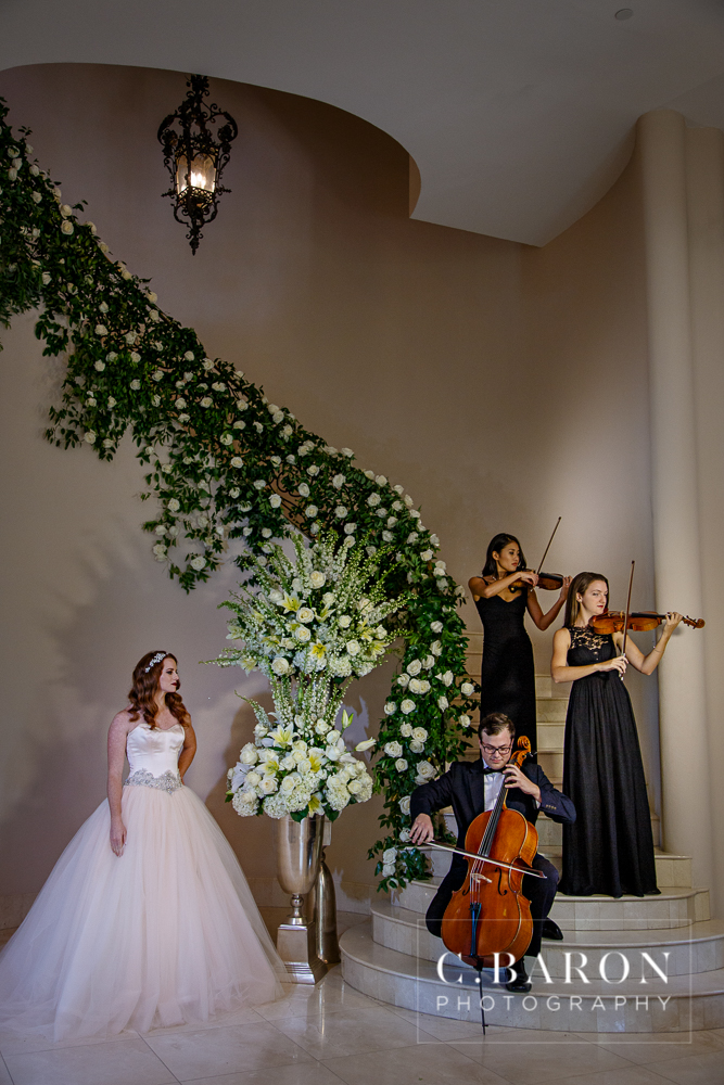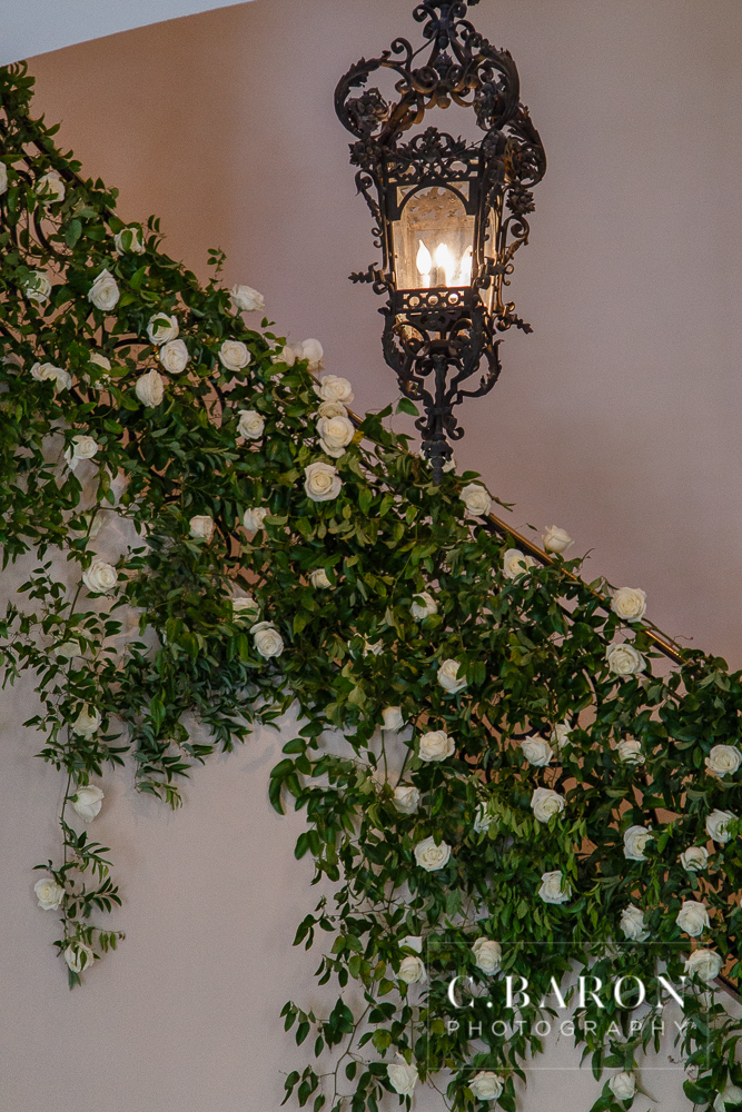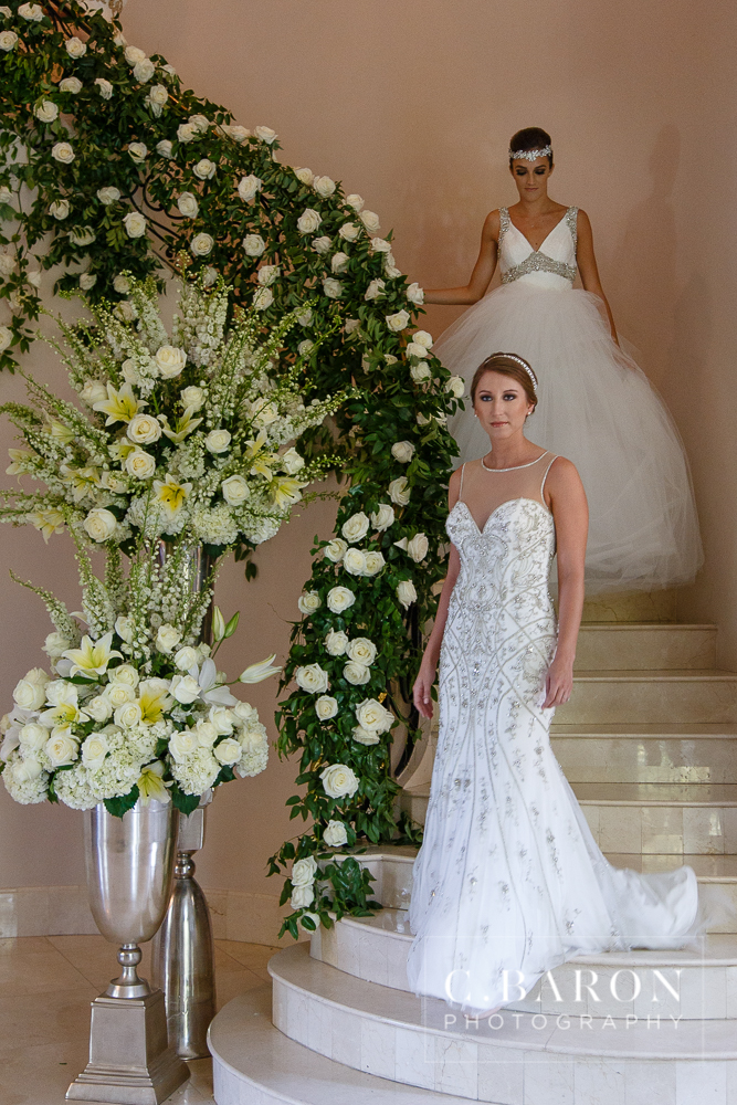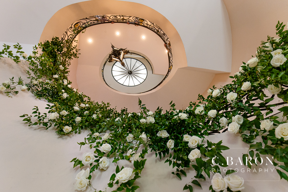 Spiral Staircases are definitely a thing. They aren’t going away. They are timeless and completely magical. I am just as captivated by spiral staircases as an adult as I was as a child. When I laid eyes upon Chateau Cocomar’s spiral staircase, I was in awe. After I was able to process complete thoughts, I envisioned beautiful brides gliding down the stairs. Naturally, we had to make this vision become a reality while we were at Chateau Cocomar! Lush Flowers dressed the stairs in lovely greenery and full white roses. Once we had feasted our eyes on all of the room’s beauty, we were able to indulge in a stunning cake by Edible Designs by Jessie!